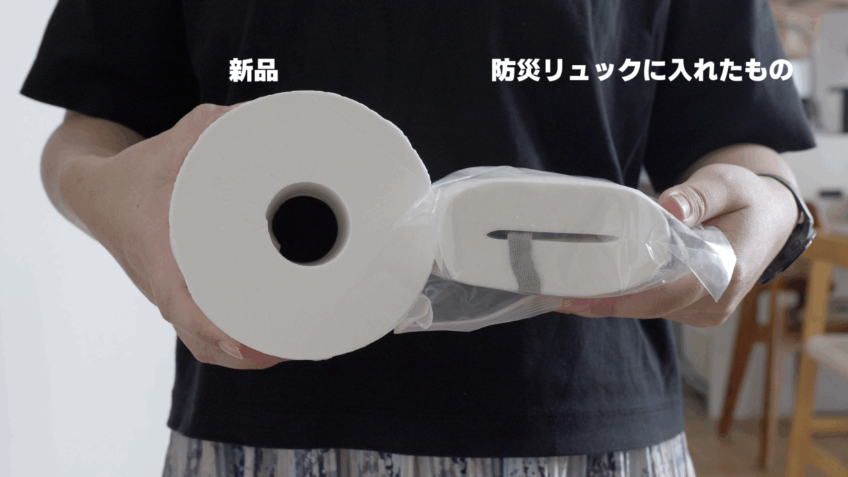 3日分の非常用トイレセットに、トイレットペーパーはそんなに要らないので、ある程度使い、半分につぶしてコンパクトにしています。