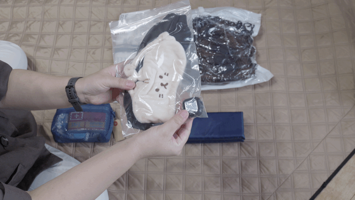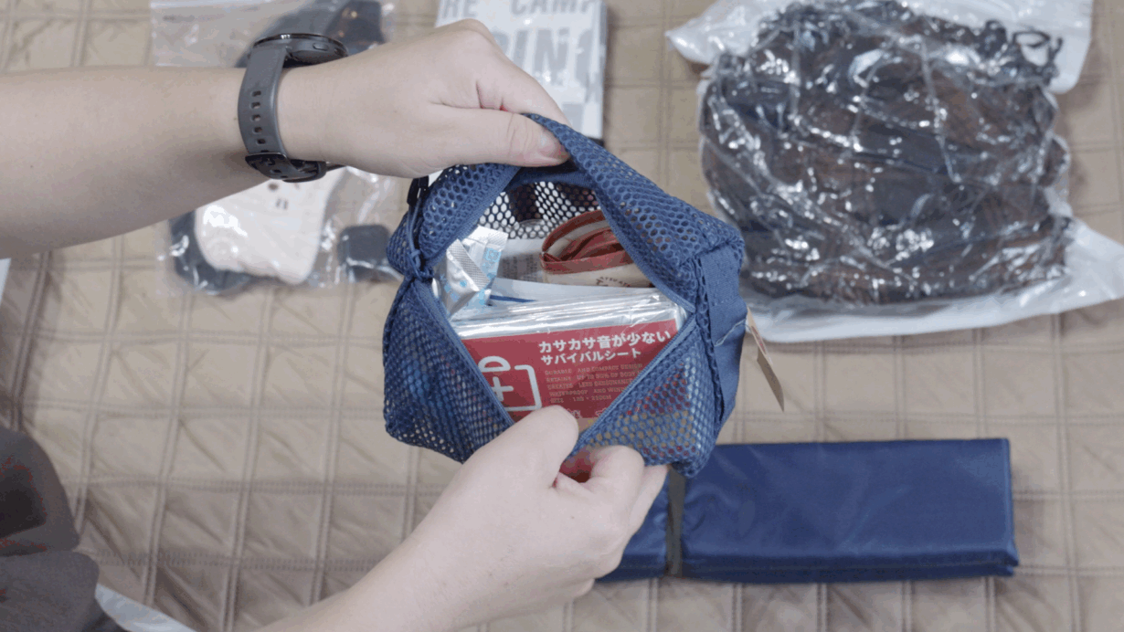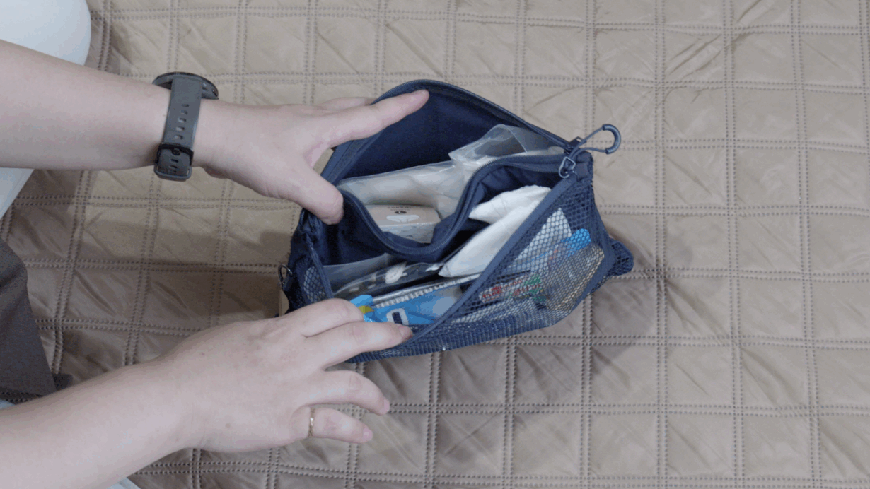 収納先を分け、衛生用品のポーチと寝具類のポーチに分けて入れています。