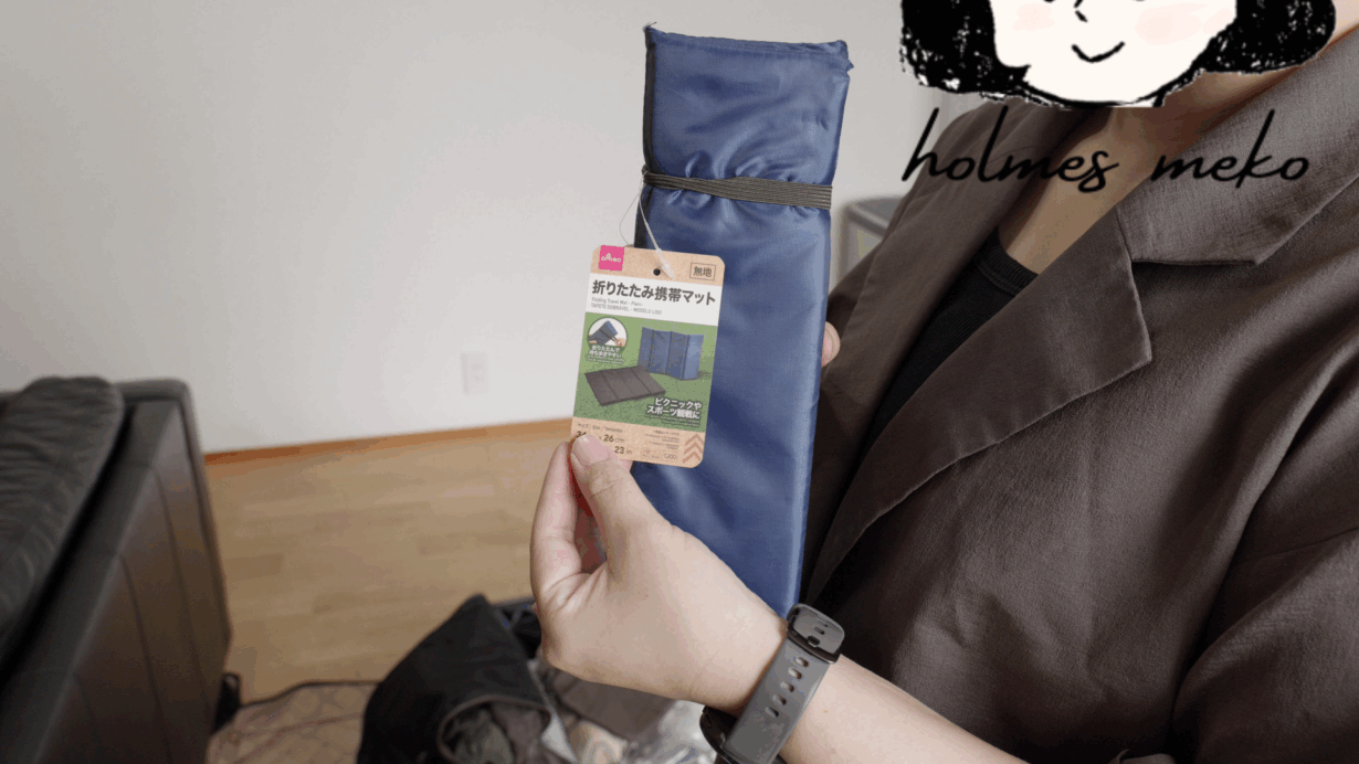 レジャーシートは好みのモノがなかったので、自宅にあるものをとりあえず入れます。分厚いと18Lのリュックには入らなかったので、薄手タイプを。