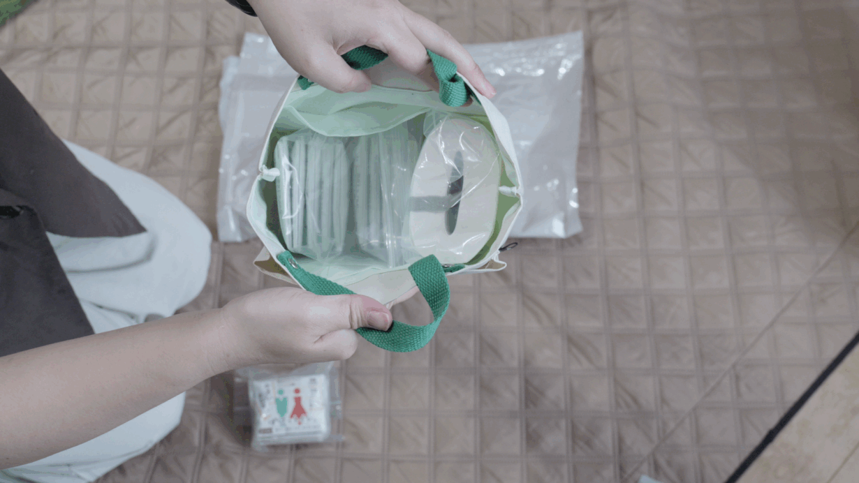 無印のダブルファスナーは、片面がメッシュ、もう片面が隠せられるようになっています。生理用品は隠してます。