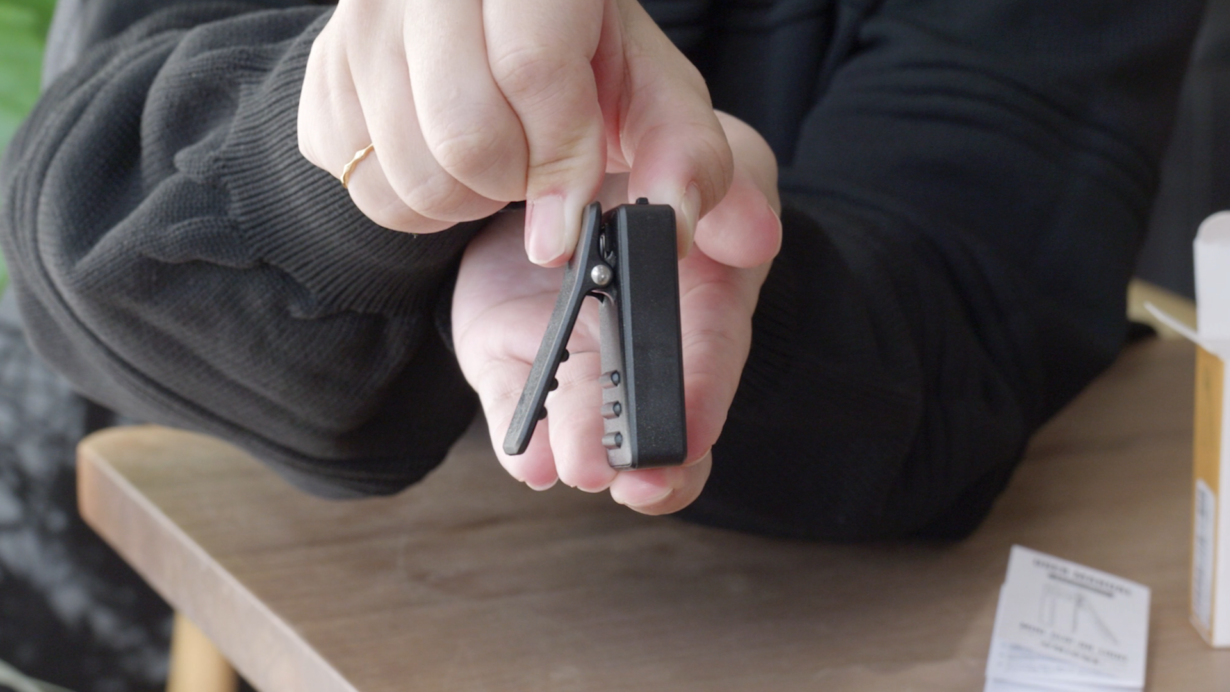 クリップは、服につけて走っても落ちないグリップ力があり、穴にひもを通せば落とす心配もなし。