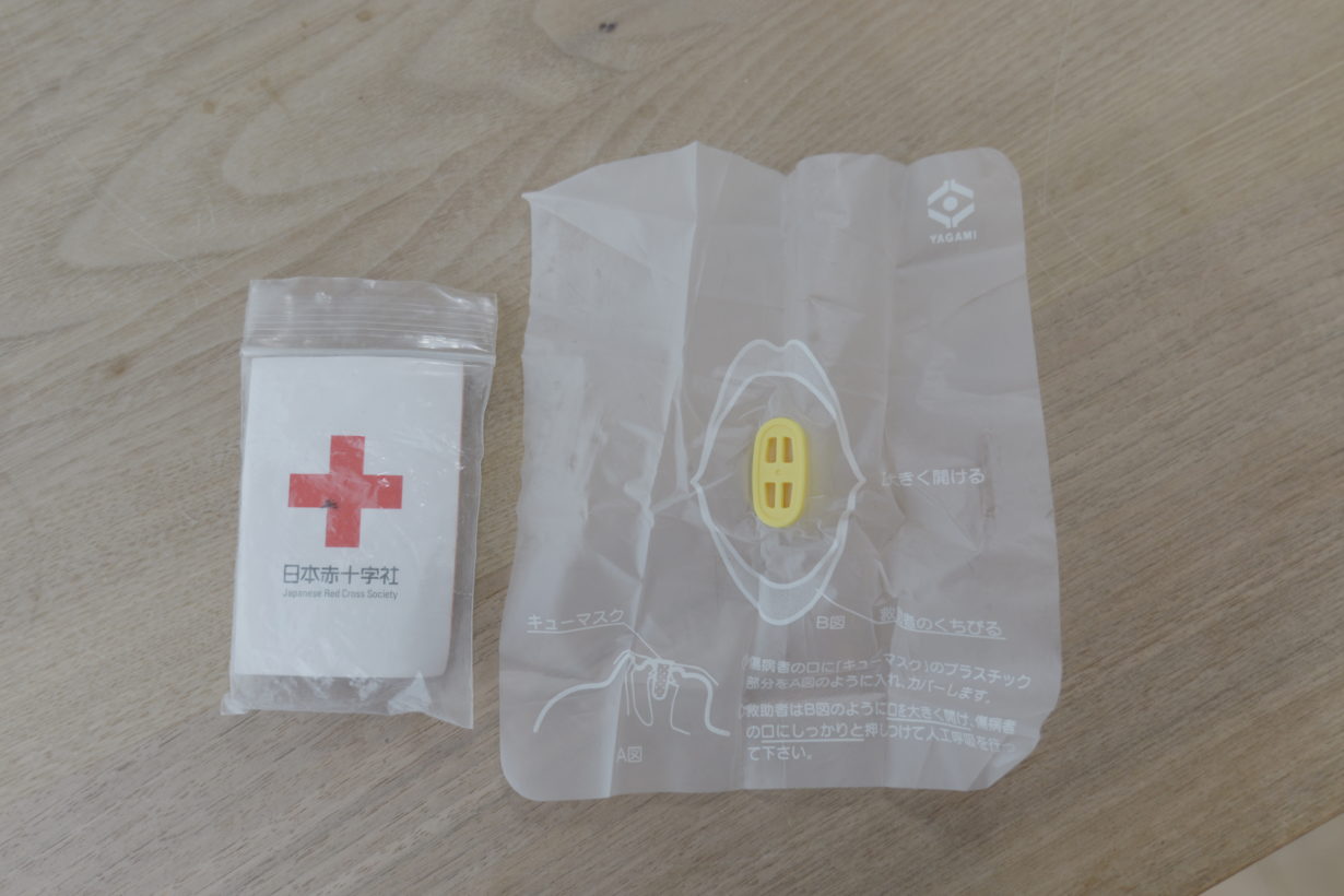 胸骨圧迫する際に、人工呼吸で肺に空気を送りますが、感染防護具として持ち運んでいました。