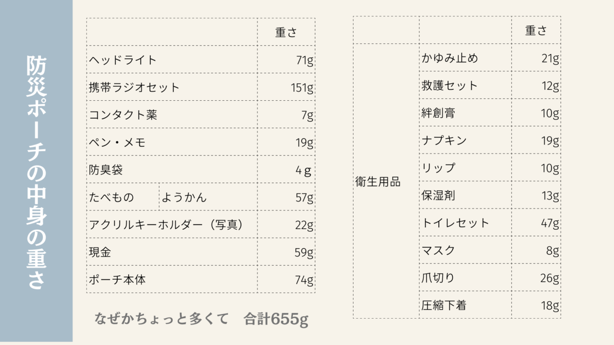今の防災ポーチは1年以上前に作ったもので、当時重さを測ったら581g。